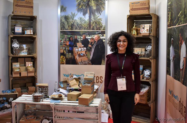 Lara Hama Rash deelt biologische dadels uit, vertelt het verhaal achter deze dadel en laat de bezoeker proeven.