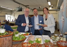 Allard Bakker (De Groene Weg), Jeroen Mustert (Wessanen Benelux) en Ellen de Kimpe (Ariza) stellen zelf een broodje samen tijdens de lunch.