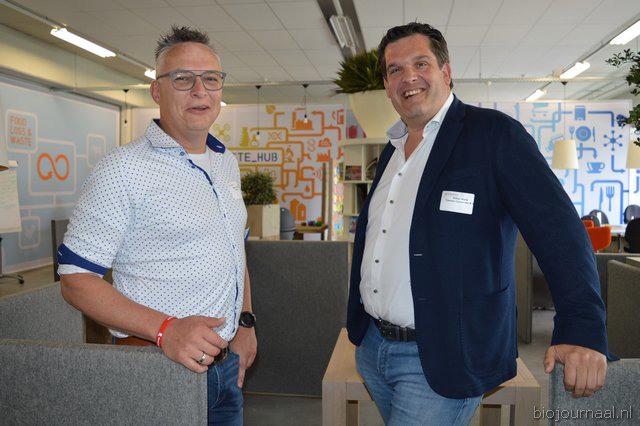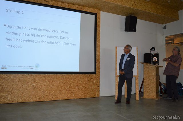 Rob Dortland (Skal Biocontrole) en Jurrien Roossien (DO-IT) kregen aan het begin van de presentatie van Heike Axmann de taak om diverse stellingen over voedselverspilling voor te leggen aan de aanwezigen.
