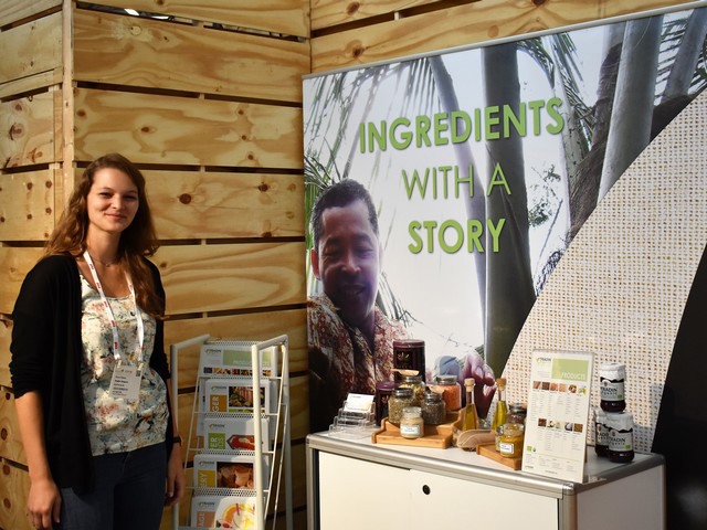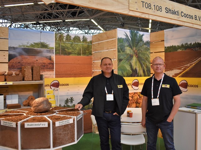 Peter Zethof en Jack van Batenburg staan op de beurs met Shakti Cocos en vertellen de bezoekers hoe belangrijk het is dat de kokos schoon is en op welke manier zij dit doen.