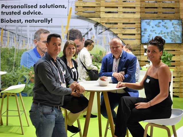 "Angel Doychinor, Lise Verachtert, Davy Luyten en Esther Vandecruys vertegenwoordigden Biobest in Amsterdam. Zij waren op de eerste dag van de beurs erg benieuwd wat het zou gaan worden. Eshter: "We hebben er nog maar een paar uurtjes opzitten, maar hebben het nu al goed druk gehad, we kijken uit naar de komende dagen."