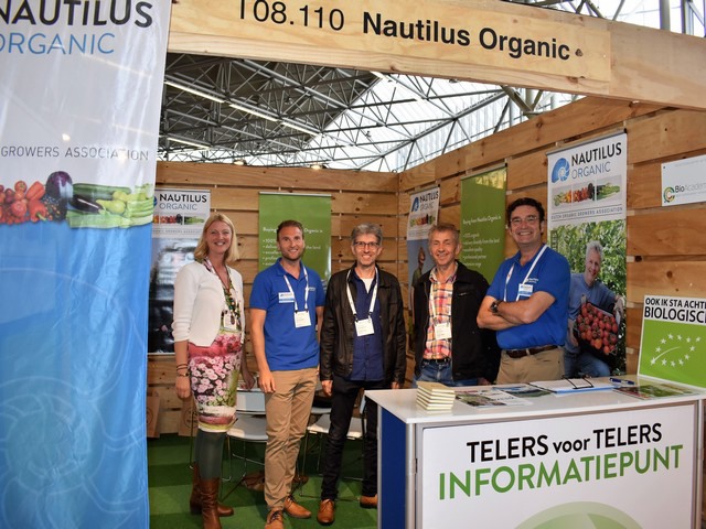 "Ingrid Veeman (Telers voor Telers), Coers Lamers (Nautilus Organic), Fons en Jac Verbeek (Bio Verbeek, lid van Nautilus) en Hein Wolff (Nautilus Organic). "Voor mij is de beurs geslaagd als ik op alle dagen 1 iemand kan spreken die wil omschakelen", zegt Hein."