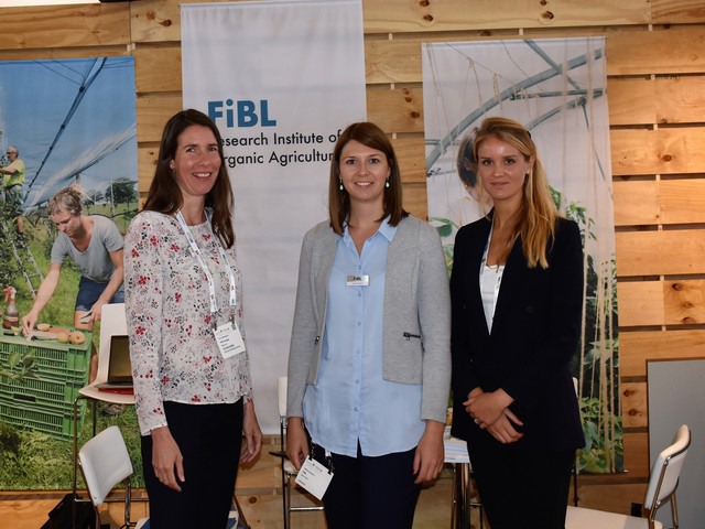 Een internationaal gezelschap in de stand van FIBL met Dora Meszaros uit Hongarije, Xenia Gatzert uit Duitsland en Pia Pedross uit Italië.
