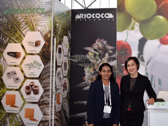 Sumudu Udeka en Alfya Sultanova staan klaar om de bezoekers te informeren over het bedrijf Riococo.