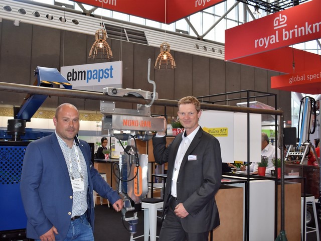 Royal Brinkmann komt met de mono-rail voor bio gewasbescherming, het systeem zorgt voor egale versprijding zonder beschadiging van de beestjes. Op de foto ontwikkelaar William Pullens met Internationall Directeur Jan Schuttrups van Royal Brinkmann.