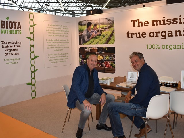 Geert Bakker (rechts op de foto) van Biota Nutrients is hier in gesprek met Frank Combee van Horticoop.