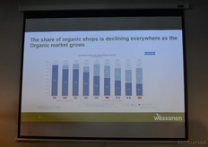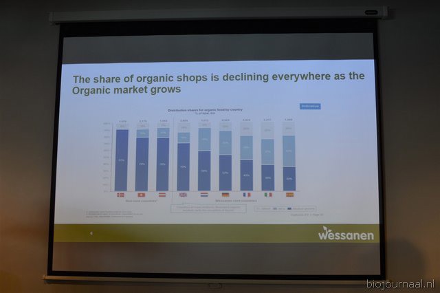 De CEO liet ook in een grafiek zien dat het aandeel van de natuurvoedingswinkels daalt in de landen waar de biologische markt het hardst groeit. Consumenten schaffen daar de bio-producten via andere kanalen aan.