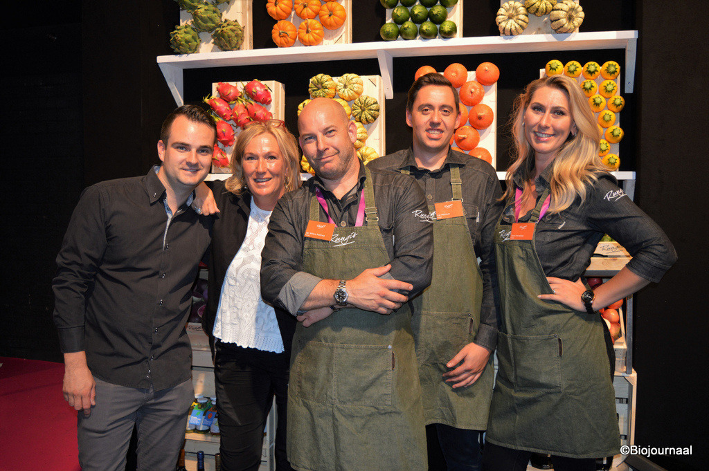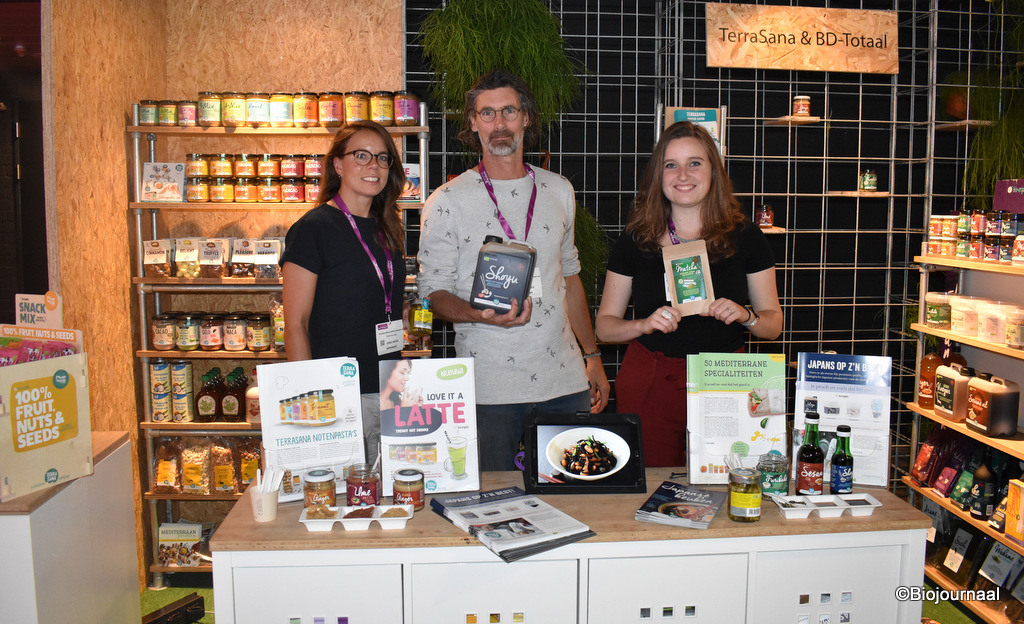 TerraSana presenteert verschillende nieuwe artikelen op Gastvrij Rotterdam, waaronder Hot & spicy peppers, glutenvrije sojasaus en matcha. V.l.n.r.: Roea Priem, Aart Jansen en Sarah de Jong.