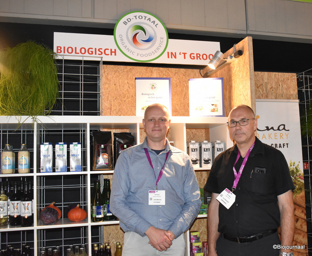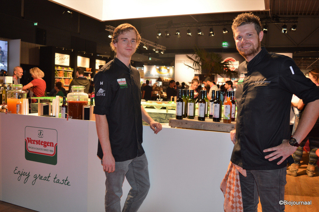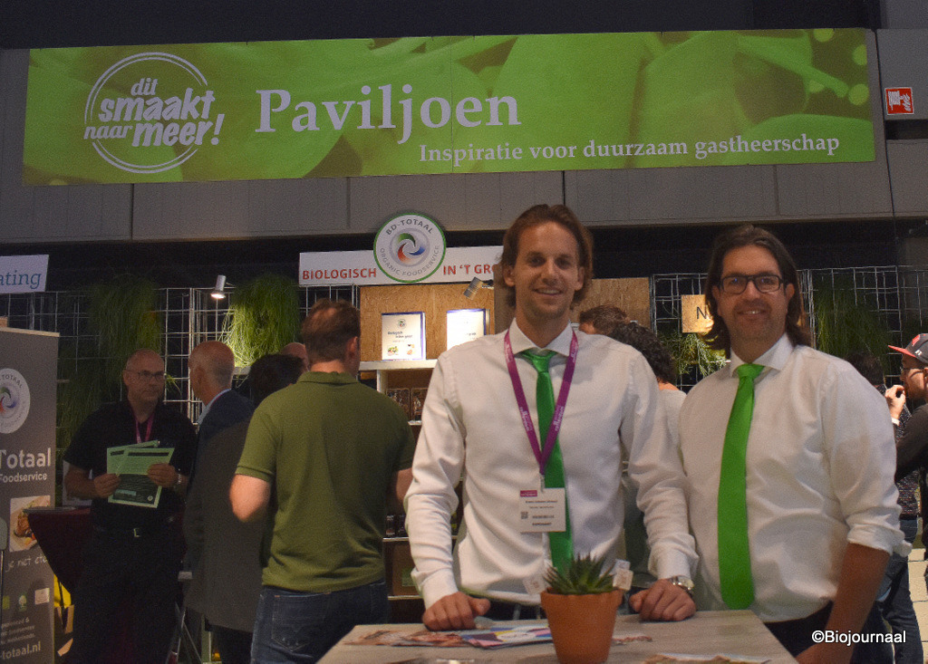 Sander Lenselink en David Gnatzy van Bio Futura. Ook dit jaar weer een groot assortiment duurzame disposables en verpakkingen uitgestald op de beurs.