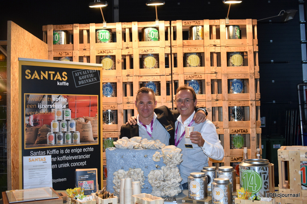 Santas koffie toont twee innovaties op Gastvrij Rotterdam: de samenwerking met GRO en volledig composteerbare koffiebekers van rietsuiker. Links: Dennis van Steen, rechts: Willem van Leeuwen.