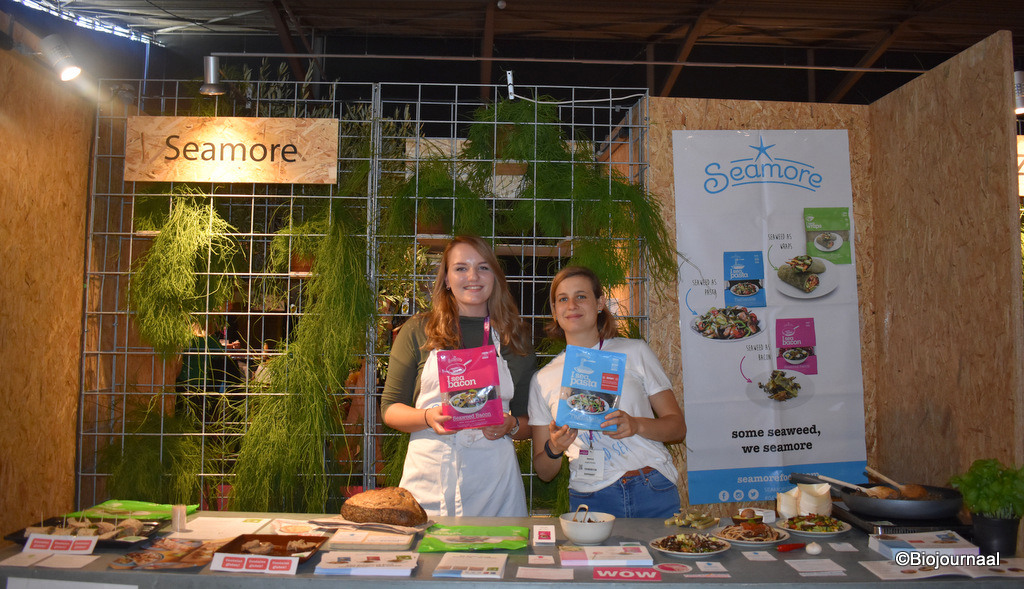 Seamore is voor de eerste keer op Gastvrij Rotterdam. Zij hebben onder andere biologische zeewierpasta’s. Ze tonen ook hun nieuwe zeewierbrood, maar dat is niet biologisch. Links: Heleen Zweepe, rechts: Angela Ferrato.