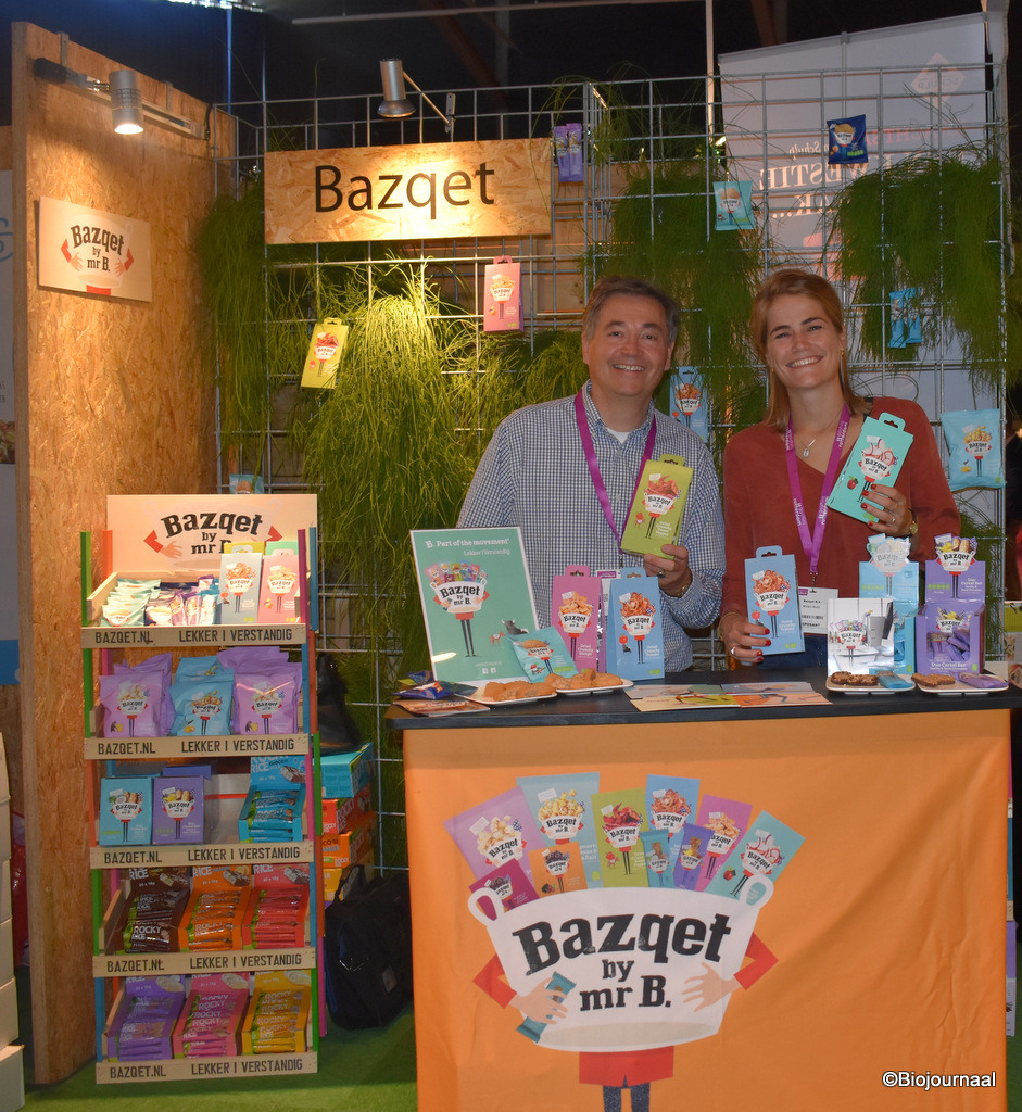 Bazquet biedt biologische ‘crunchies’ aan in vier smaken: appel, mango, paprika en tomaat. Links: Michiel Bouvy, rechts: Miriam Muhl.
