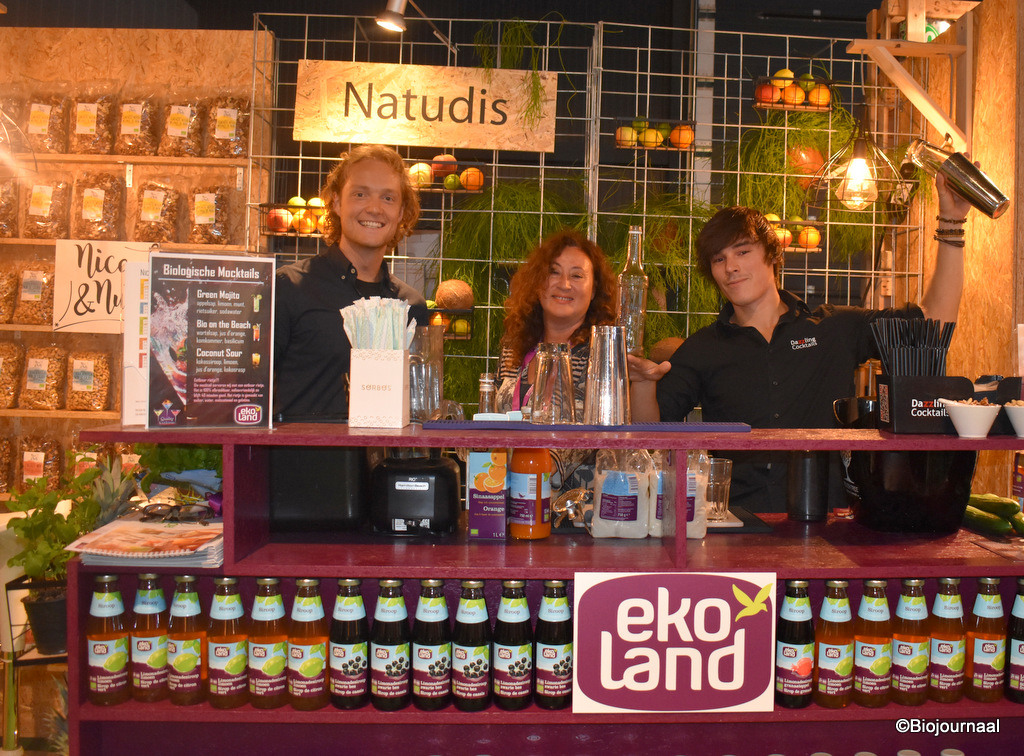Natudis maakt biologische mocktails op Gastvrij Rotterdam. “Daarnaast willen wij ook ons verhaal laten zien”, aldus Wouter Wezenbeek (midden). Links: Mylène van Ark, rechts: Arvid Bruinier.