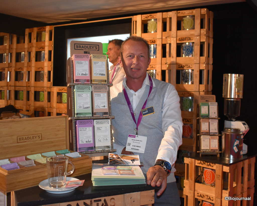 Bart de Jongh van Santas koffie/Bradley’s toont hier het nieuwe assortiment biologische thee voor de horeca, dat ook fairtrade is.