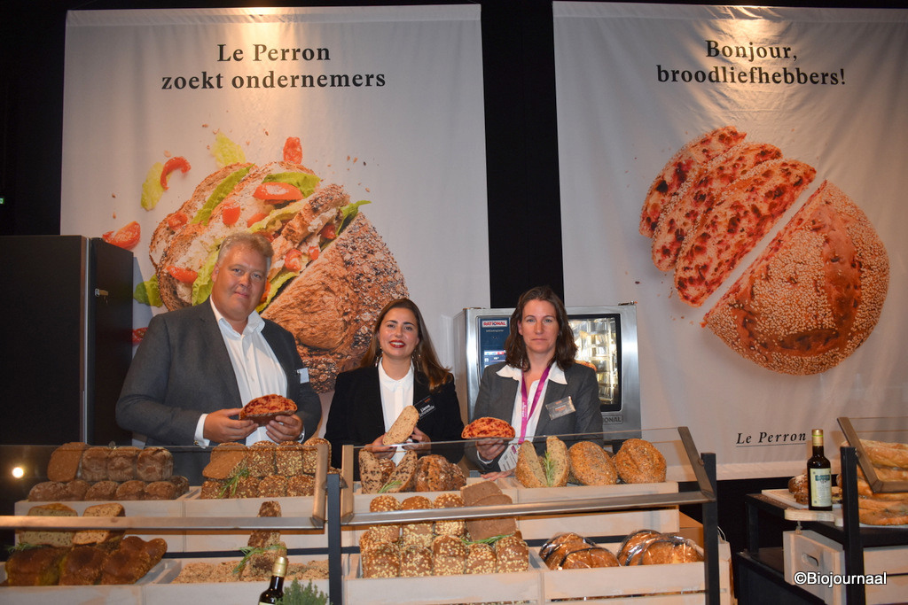Le Perron toont op Gastvrij Rotterdam drie nieuwe broodsoorten: brood met bietjes, brood met wortel, anijs en hazelnoot en brood met bierborstel. V.l.n.r.: Ruud Booij, Lianne Schonewille en Veronique Simons.