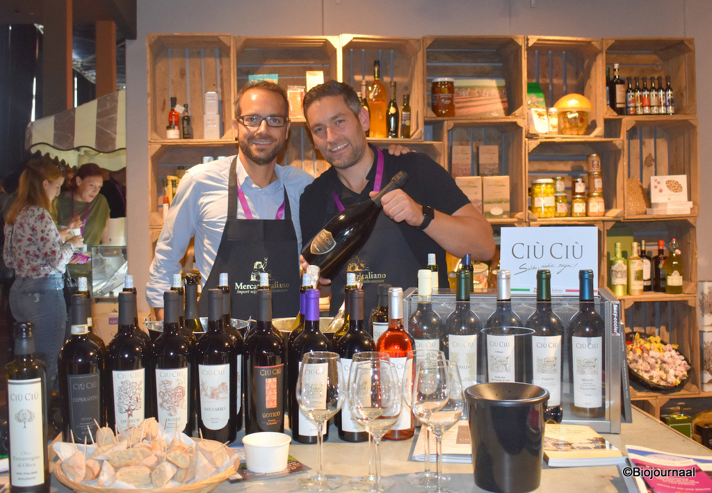 Mercato Italiano is een importeur van Italiaanse producten. Hier tonen ze onder andere hun bio-wijnen Ciù Ciù. Links: Pado Agostinelli, rechts: Sandro Morro.