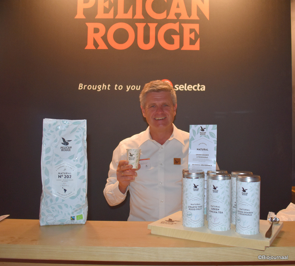Pelican Rouge heeft de lijn Natural. Deze lijn bestaat uit koffie en thee en is biologisch, fairtrade en CO2-neutraal. Op de foto staat Roger Knecht.