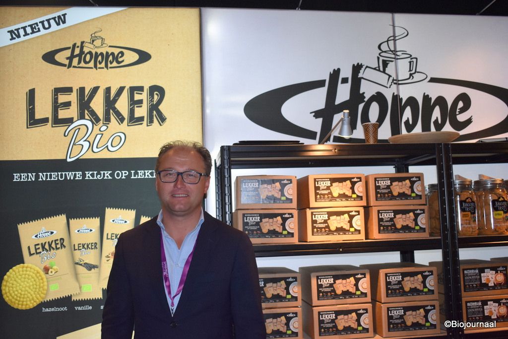 Bjorn van der Meijden van Hoppe toont het nieuwe biologische assortiment koekjes. “Wij leveren al 55 jaar koekjes, maar vanaf nu dus ook met een bio-receptuur.”