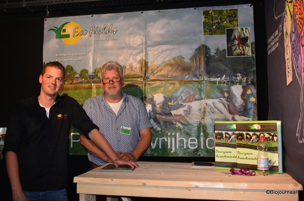 Remco Lieman (links) en Teun Gundelach (rechts) van Ecofields hebben onder andere biologische lamsköftes en kalfsvlees in het assortiment. Ook jus de veau is een topproduct voor de horeca.