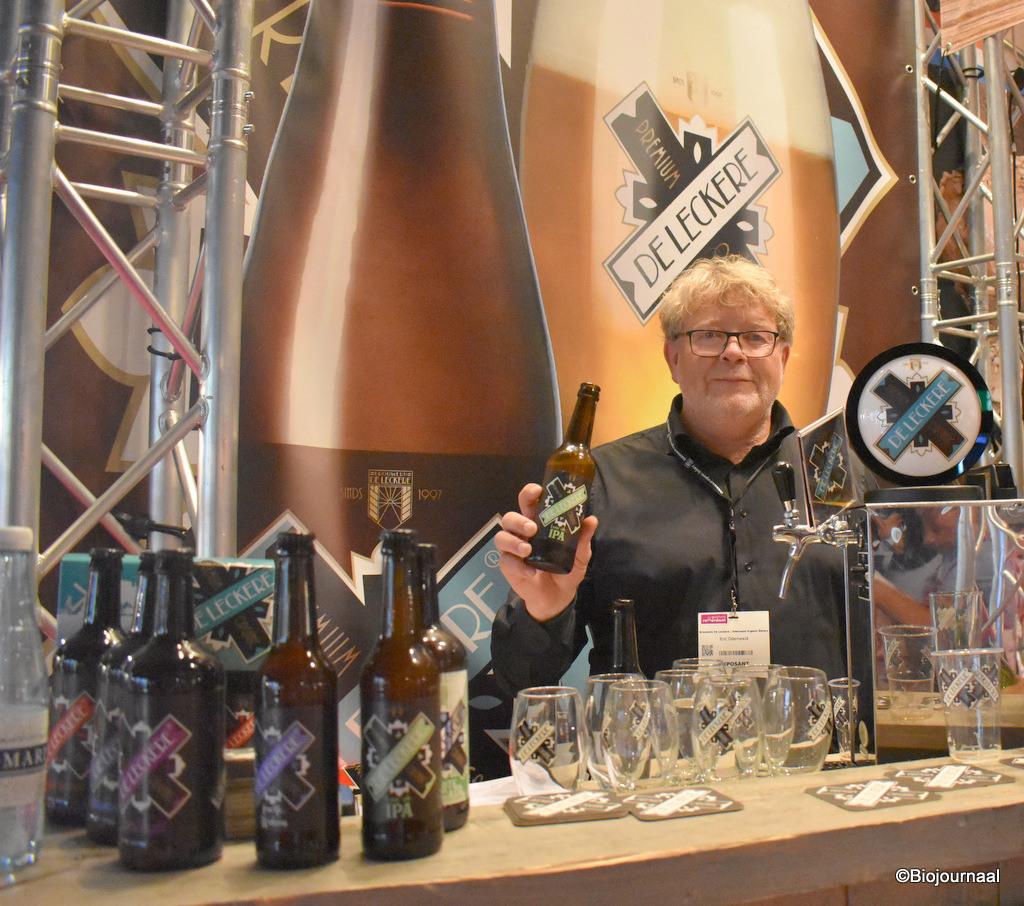 Eric Odenwald van De Leckere toont twee alcoholarme bio-bieren: een weizen en een IPA.