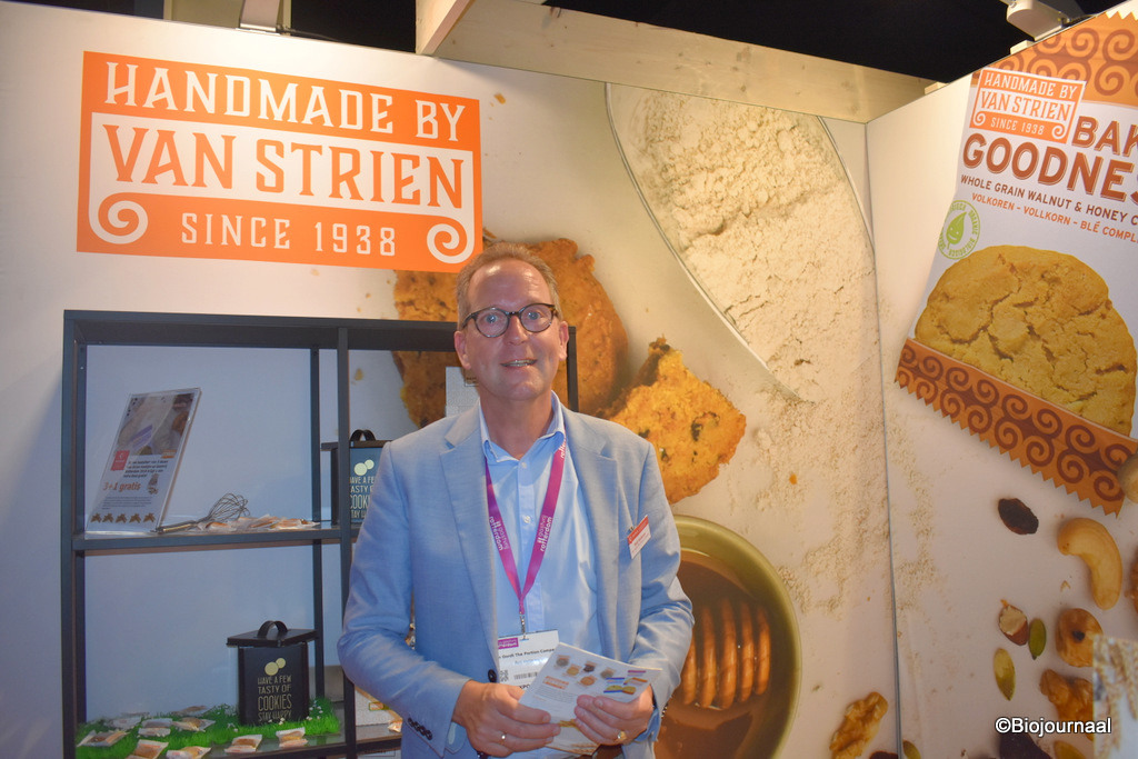 Rob Veltman van Van Oordt heeft Baked Goodness nieuw in het assortiment. Dit zijn biologische koekjes. De grote variant is er in drie soorten en de kleine in twee.