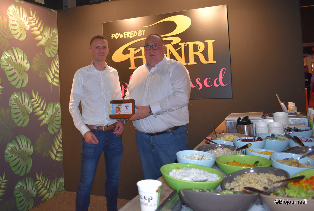 Henri biedt verschillende bio-producten aan, waaronder soep, quinoa en bolognaise saus. Binnenkort gaan zij samenwerken met Kromkommer. Links: Roel Dekker, rechts: Hans de Kruijf.