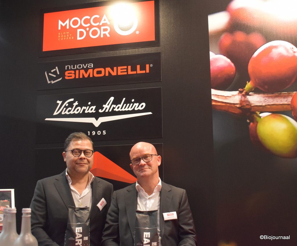Robert Vreede (links) en Leon de Grund (rechts) tonen de bio-lijn Earth koffie. Deze lijn staat ook in het teken van maatschappelijk verantwoord ondernemen.