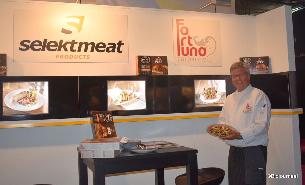 Arend Nijland van Selektmeat laat hier biologische carpaccio zien, die ze nu ongeveer een jaar in het assortiment hebben.