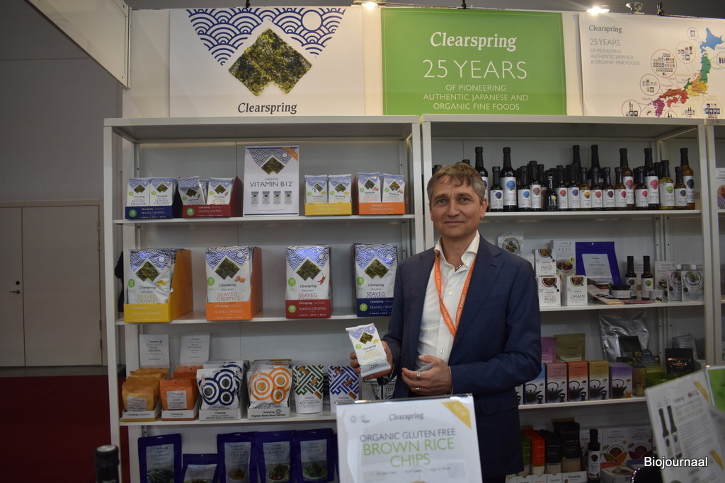 Clearspring is eigenlijk een Brits bedrijf, dat nu ook een plaats op de Nederlandse markt wil veroveren. “We komen hier met de nieuwe zeewier-crispies, die zijn rijk aan vitamine B12. Daarnaast hebben we ook sojasaus die geheel gemaakt is in de UK, dat is ecologisch heel interessant”, vertelt Lucio de Berti.