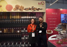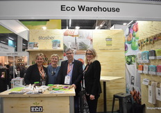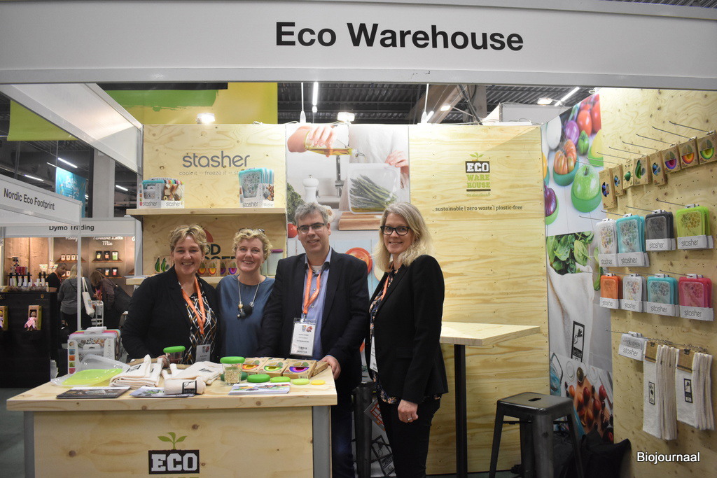 Johan en Ellen Visser van Eco-warehouse presenteren op de beurs onder andere de onlangs toegevoegde lijn Food Huggers. Zij staan hier op de foto met Adrienne Mcnicholas (Food Huggers) en Calette Terhaerdt Losic (consulente voor handelsbetrekkingen). De stand van Eco-warehouse is helemaal vernieuwd.