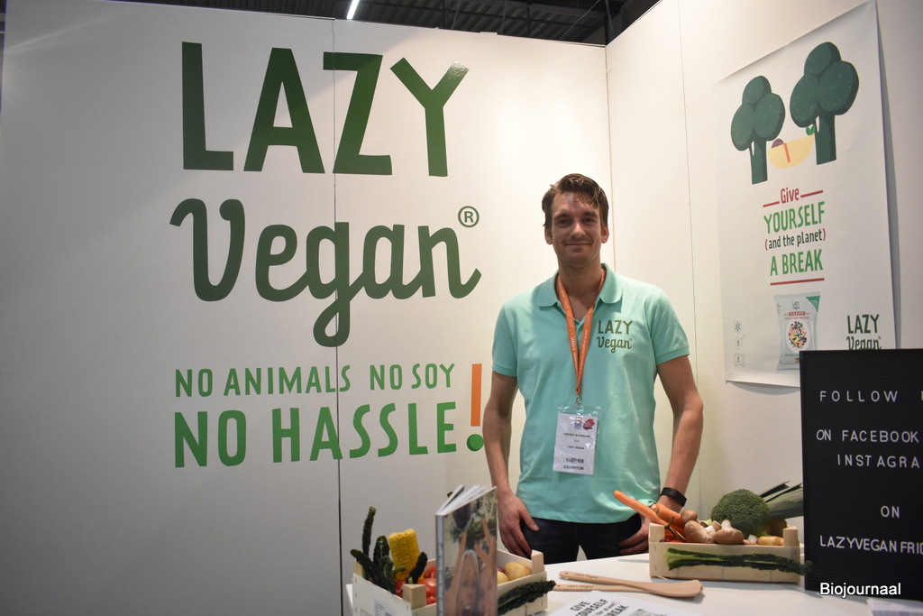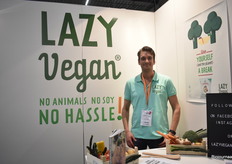Vincent Bosgraaf van Lazy Vegan toont de vegan kant-en-klaar maaltijden die zij in het assortiment hebben. Deze hoeven alleen maar opgewarmd te worden.