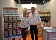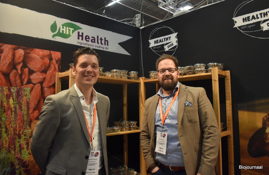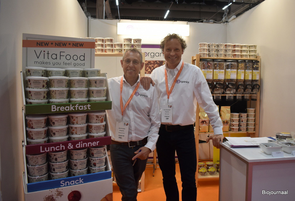 Herco Schoemaker en Jetse Schokker van IDorganics presenteren hun nieuwe producten van Vita Food. “Dit assortiment bestaat bijvoorbeeld uit kant-en-klare havermout en stampotten. Daarnaast tonen we ook ons aanbod dat onder andere bestaat uit noten en zuidvruchten.”
