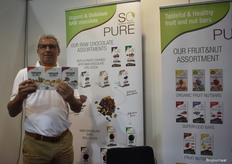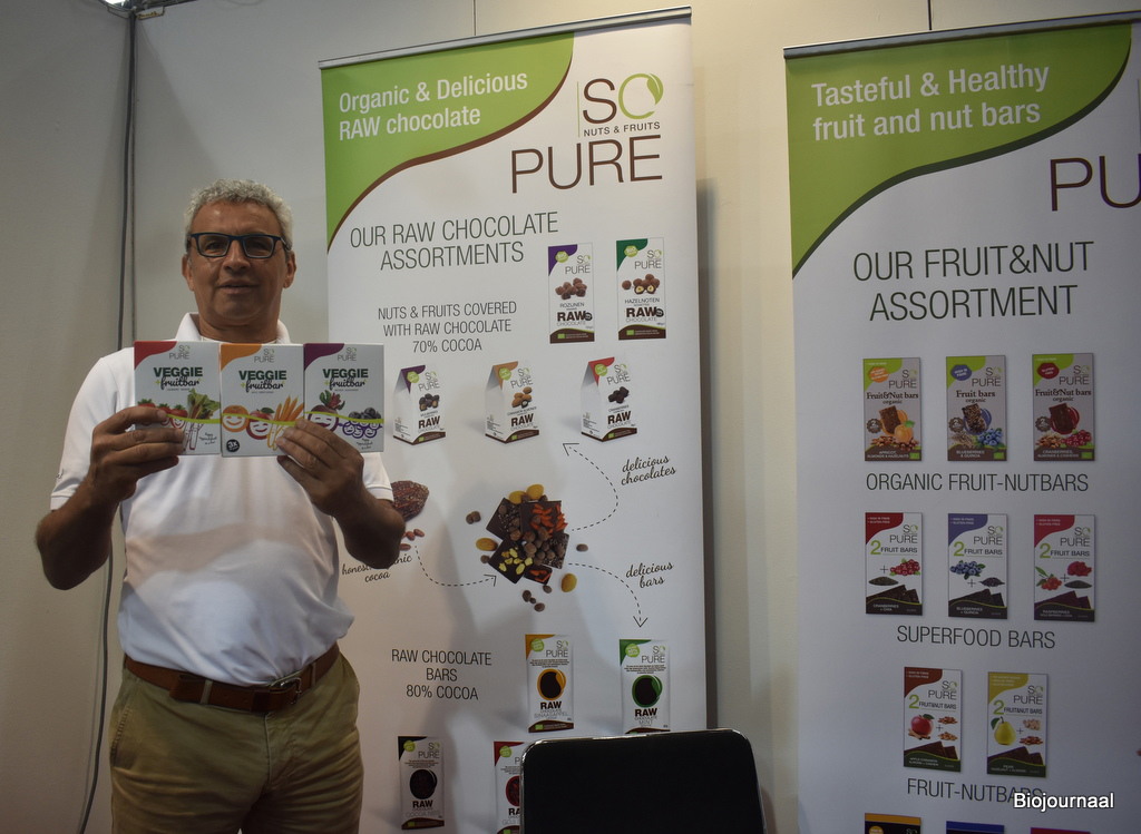 Ric Zuiverloon van SoPure/Les Chevaliers heeft nieuwe groenten-fruitrepen bij zich. “Dit is een innovatie, want er bestaan al veel fruitnotenrepen, maar er zijn nog niet veel groenten-fruitrepen”, aldus Ric. Er zijn drie varianten van de repen.