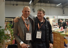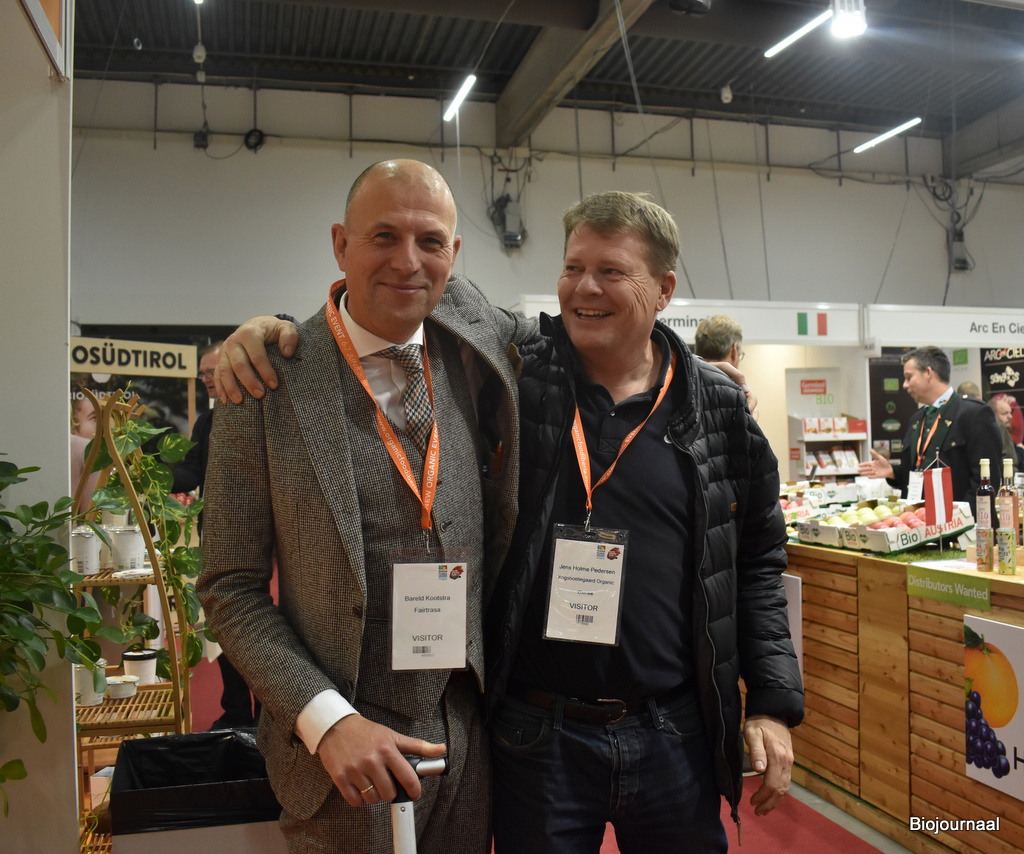 Bareld Kootrstra van Fairtrasa kwam ook een kijkje nemen op de beurs. Bij hem staat Jens Holme Pederson, een teler van blauwe bessen.
