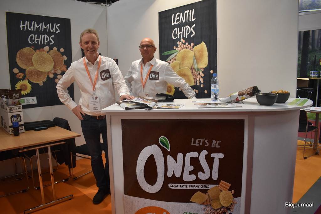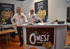 Jos de Moor (links) en Willem de Kanter (rechts) van O’Nest hebben hun chips meegenomen naar de beurs. “Deze producten zijn nieuw in Scandinavië. We hebben drie varianten: kikkererwten, linzen en quinoa. We zijn ook bezig met nieuwe producten.”