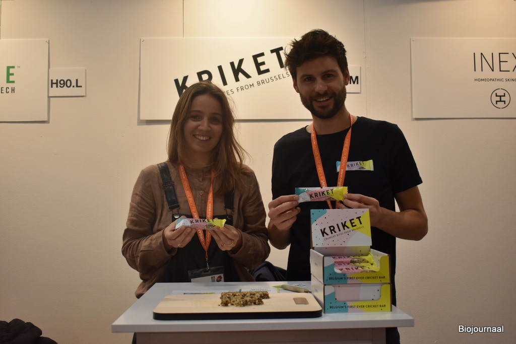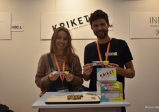 Kriket is een nieuw bedrijf met een innovatief product, dat Michiel Van Meervenne en Kaat De Vis presenteren op de beurs. “Wij hebben de eerste biologische krekelreep”, vertelt Michiel. “De krekels worden in Brussel gekweekt. We willen graag het taboe doorbreken met onze producten.”