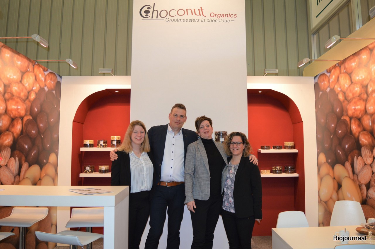 Choconut stond voor het eerst op de BIOFACH.. "We willen graag de Duitse markt op. Alles wat kan draaien, chocolateren wij. Nieuw is gechocolateerd hennepzaad", vertelt Edith Alta. Op de foto: Fleur Groote, Anno Groote, Edith Alta en Marian de Bruijn.