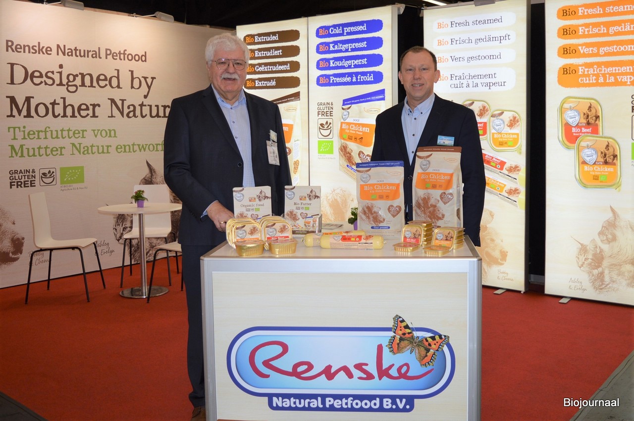 Jan van den Berg en Frank van Zutphen debuteerden met Renske Natural Petfood op de beurs. Jan: "We zoeken gespecialiseerde distributeurs die onze producten koesteren. Leuk om te melden is dat we ook lijnzaad importeren."
