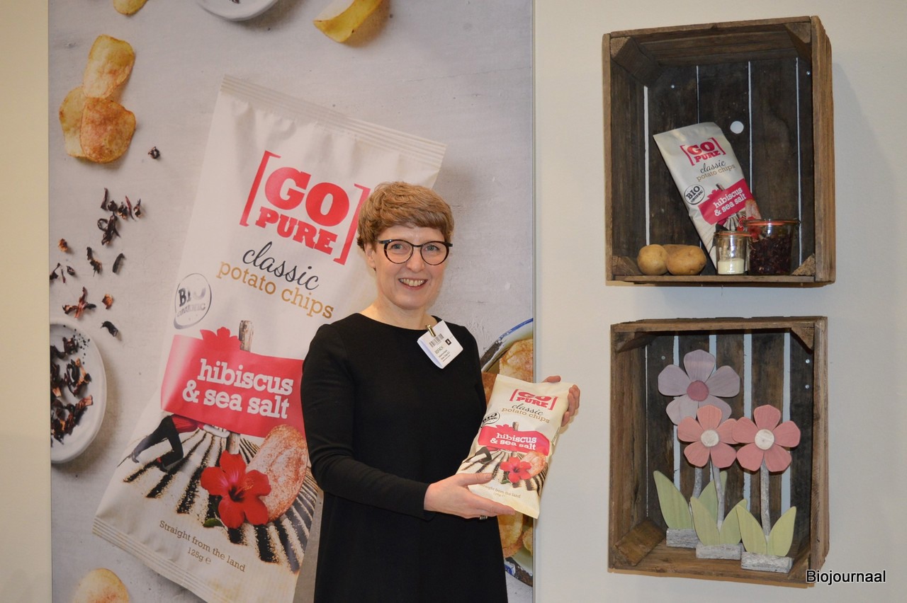 Katharina Haack toont bij Yellow Chips de nieuwste Go Pure-chips met de smaak Hibiscus en seasalt.