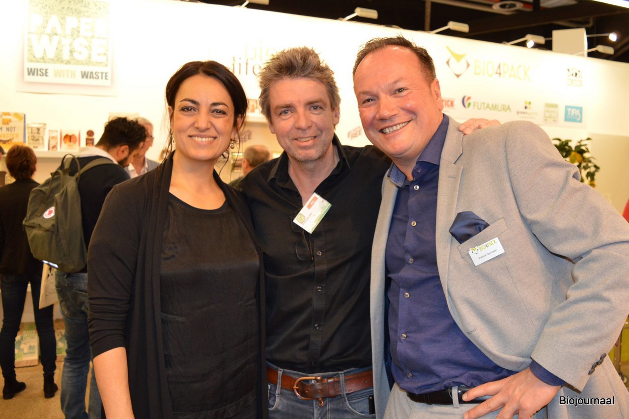 Sascha de Lint en Addy Rouwenhorst (GreenAge) met Patrick Gerritsen van Bio4Pack.