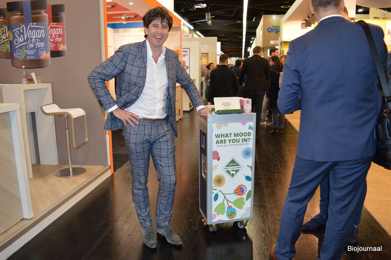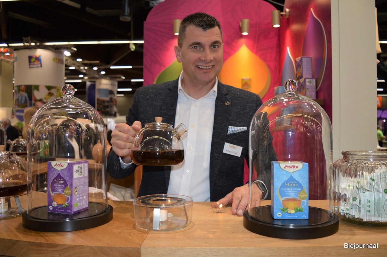 Arthur Zwart met de 'Für die Sinne'-thee van Yogi Tea. In de stand kon men ook proeven van de nieuwse For the Senses-theeën en de Ice Tea die nu ook in literpakken verkrijgbaar is.
