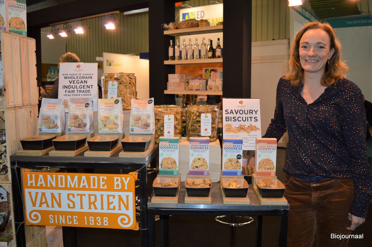 Els van Strie presenteerde twee varianten hartige staafjes namens Banketbakkerij van Strien. Ook nieuw zijn de cookies onder de lijn 'Handmade by van Strien'. "Hierin zitten meer vezels en noten, maar ze zijjn vooral nog steeds heel lekker."