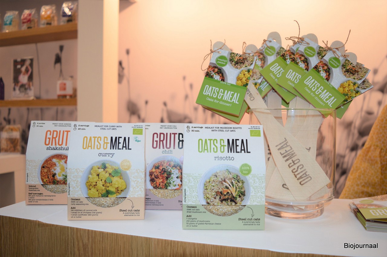 René van der Locht en Rob van den Berg tonen trots de vier maaltijdkits van het gloednieuwe merk GRUT&. In deze cleanlabel maaltijdkit worden Nederlandse havergrutten gebruikt als kookgraan.
