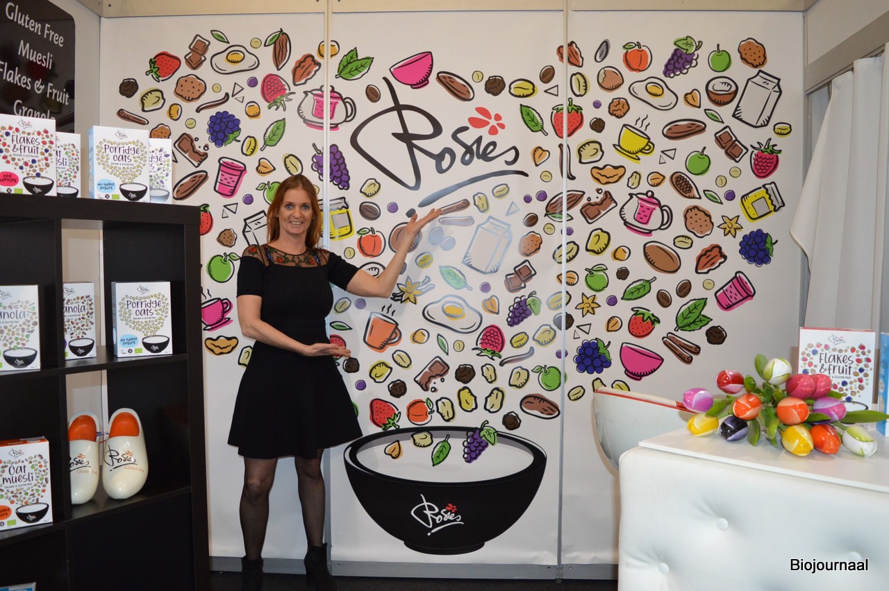 Simone Schellekens van Rosies vertelt dat over een week of 8 het nieuwe design klaar moet zijn. Op de achterwand van de stand zie je een voorproefje. Ook komen er kleine verpakkingen van de cornflakes aan,