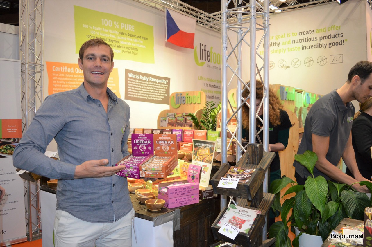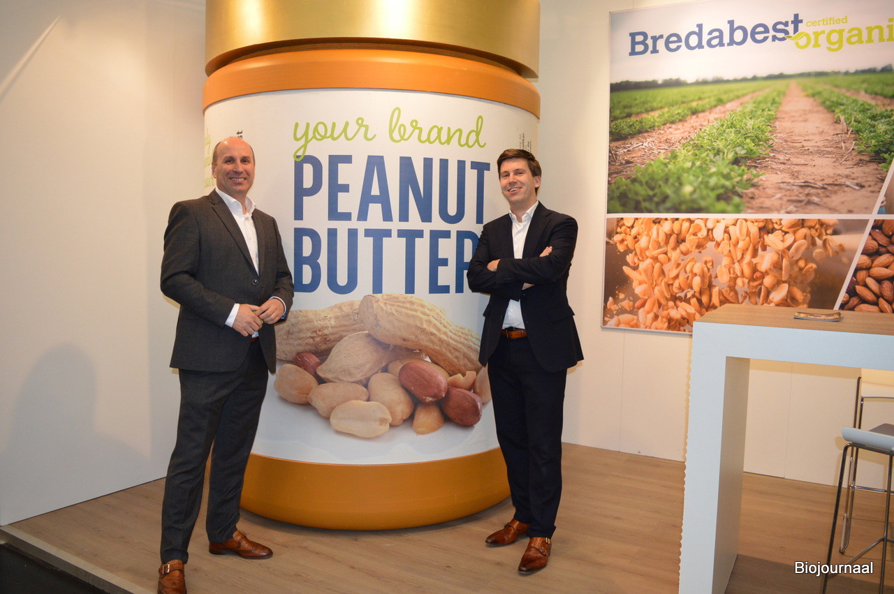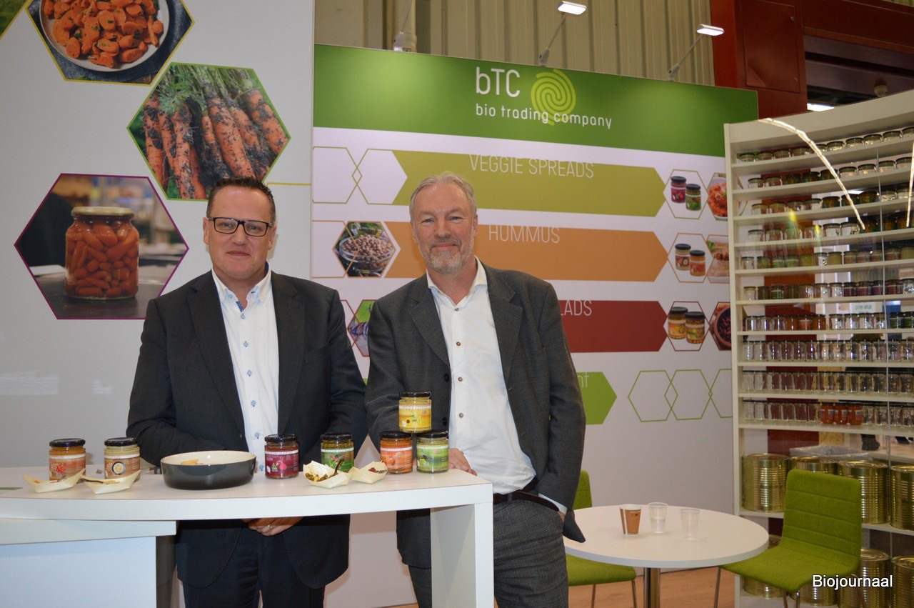 Robert Reindsen en Dik Goorhuis in de vernieuwde stand van Bio Trading Company. Nieuw zijn de Veggie spread beetroot & apple en de Veggie spread kale & chili.