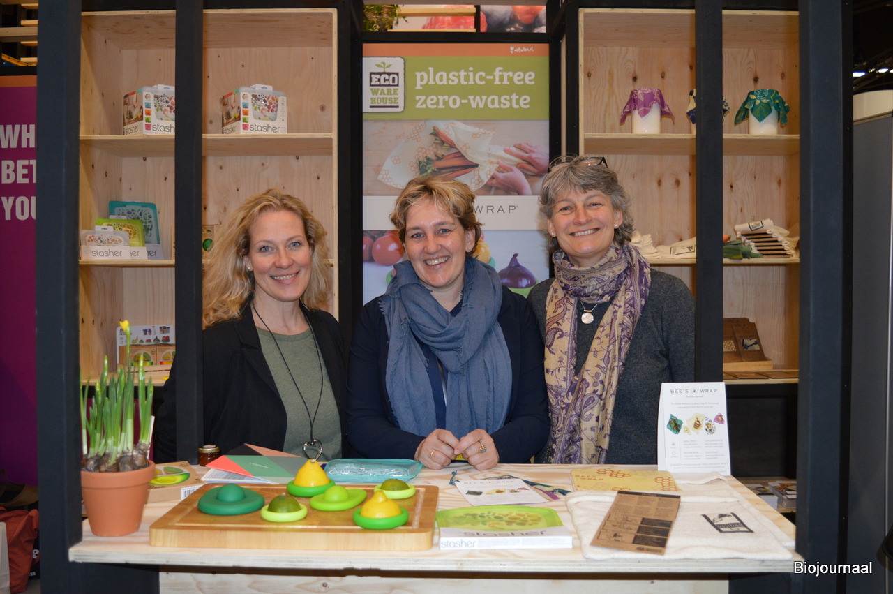 Kris Hoffmann (international sales manager Bee's Wrap), Ellen Visser (Eco warehouse) en Carrie Herzog vertelden de bezoekers onder meer over de Food Huggers, dit is 1 van de duurzame verpakkingsoplossingen die Eco warehouse biedt.