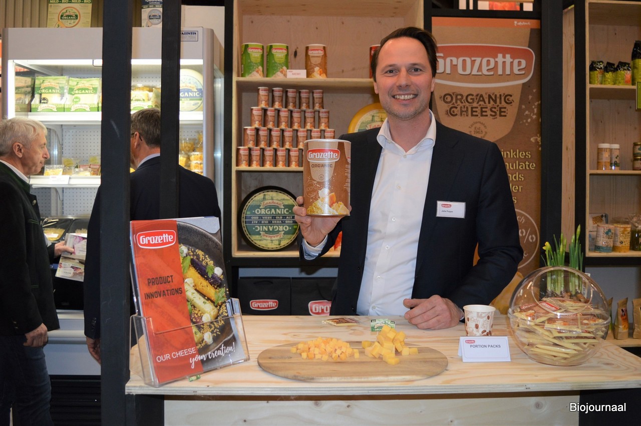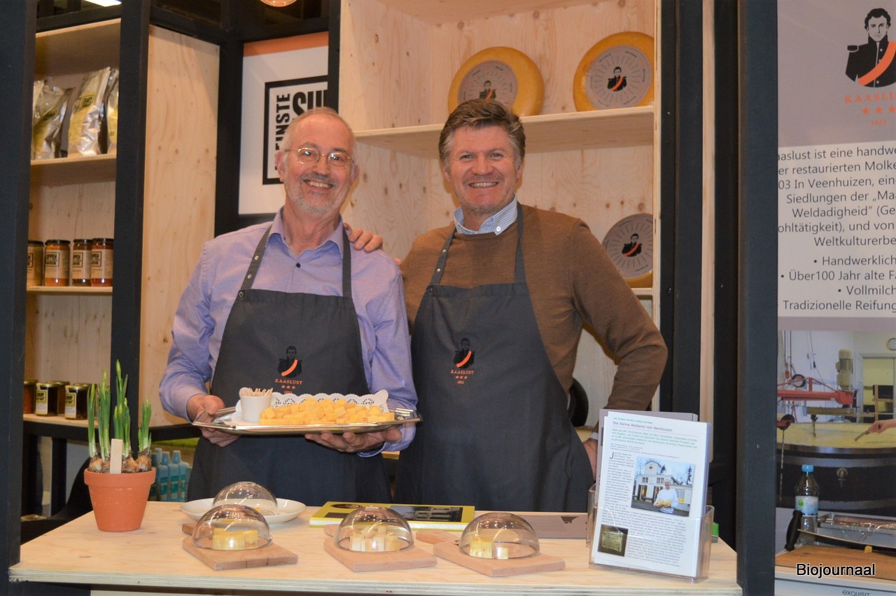Jelle Poppe van debutant Grozette. Achter hem is zijn collega Patrick Beems in gesprek met een geïnteresseerde. "Onze biologische strooikaas hebben we nu ook in een 750 gram-variant. Alles wat we in een reguliere variant hebben, kunnen we ook in biologische aanbieden."