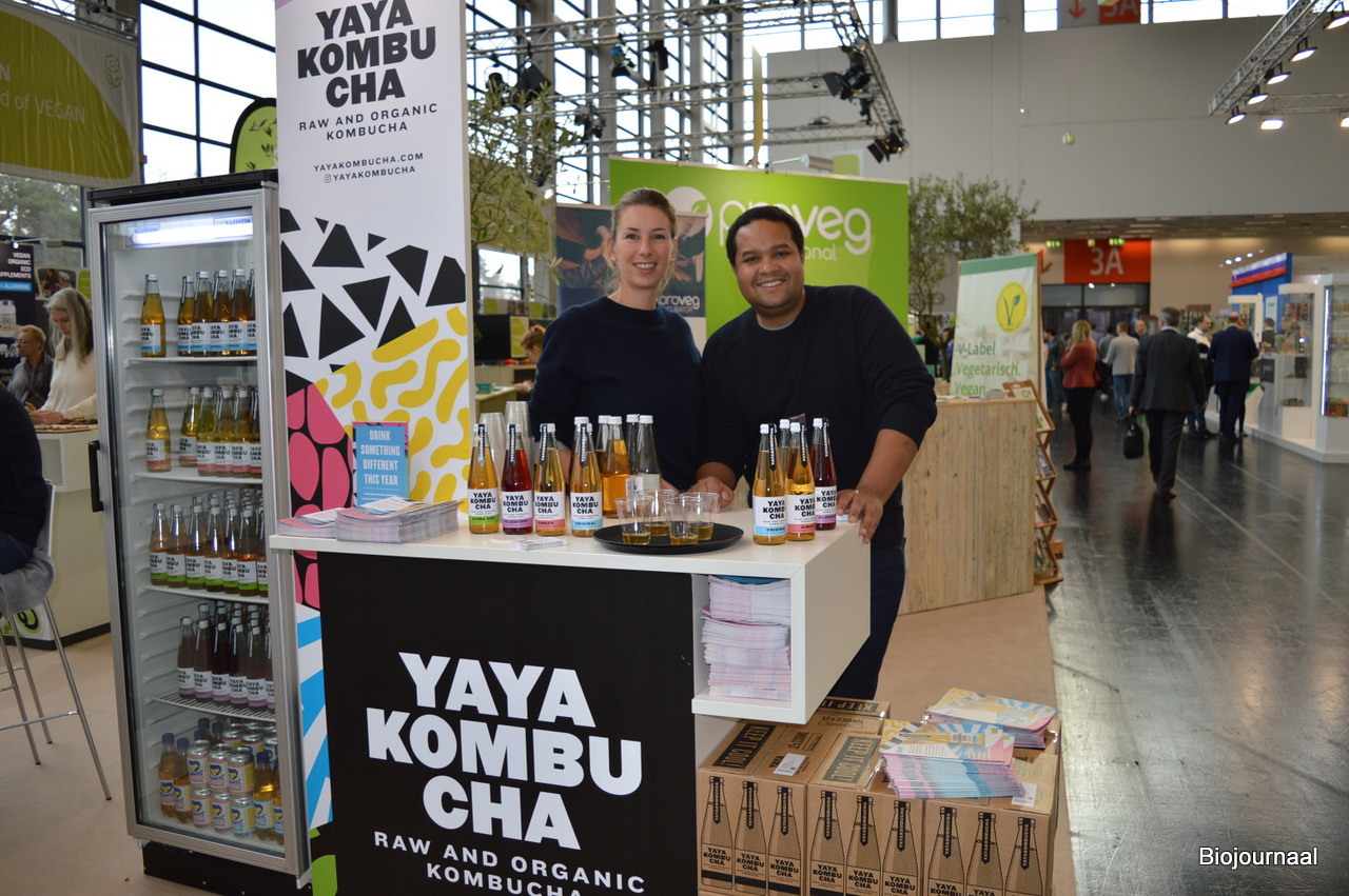 Charlotte Krijger en Tom Vollebregt lieten bezoekers proeven van de verschillende varianten Yaya Kombucha. Charlotte: "De Citra Hop is als limited edition gebracht, maar is nu een vaste waarde in ons assortiment. We willen in de toekomst vaker limited editions uit gaan brengen. Vanaf april ligt de Citra Hop bij Ekoplaza."