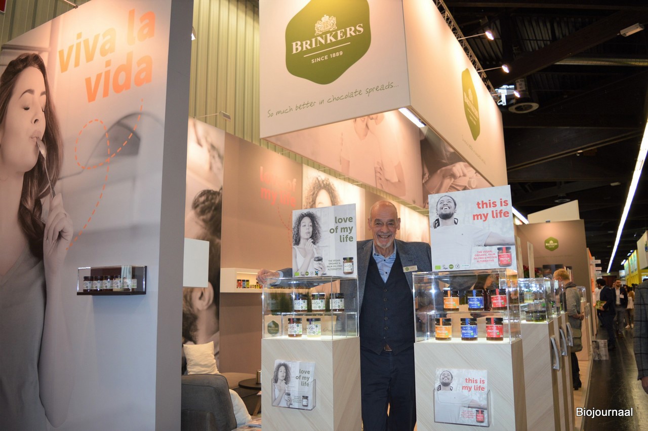 Danny Schuwer van Brinkers tussen de nieuwste chocoladepasta's. Links op de voorgrond de nieuwe White Coconut- en Almond-varianten van La Vida Vegan. Nieuw voor de Nederlndse markt zijn ook drie Chocolate Rhapsody-varianten: 25% Pistachio, de Crunchy Almond & Matcha en de Gianduja. Danny: "In onze nieuwe stand willen we beleving rond onze merken creëren. Onze huisstijl is op geluksmomenten gericht." Hij vertelde ook dat de slogans en merknamen (Viva la Vida, Chocolate Rhapsody, Love of my life e.d.) bewust verwijzen naar muziek.