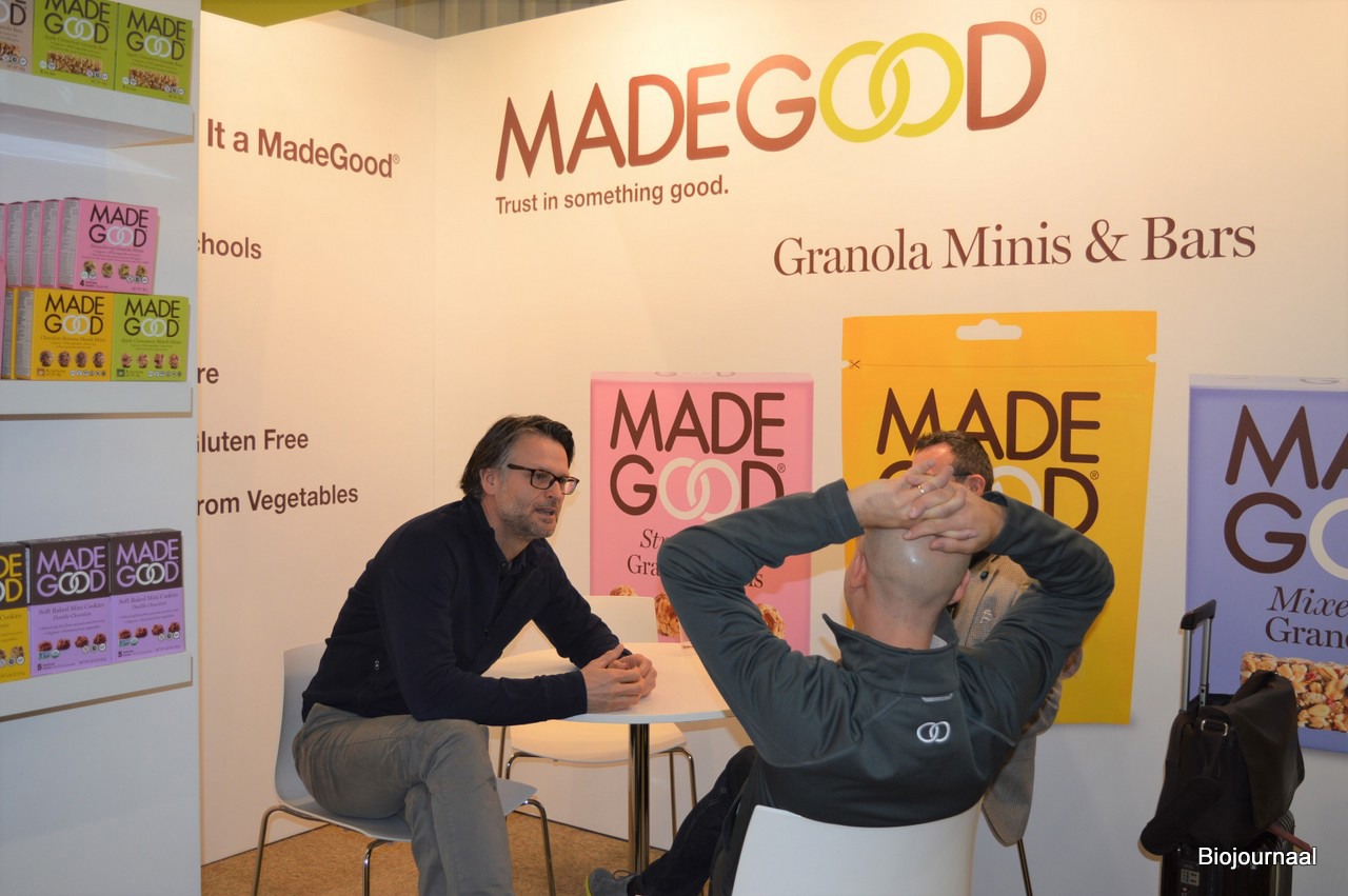 Andy van Ham vertelt in de stand van Riverside International over de nieuwste producten van MadeGood: Organic Soft Baked Mini Cookies.